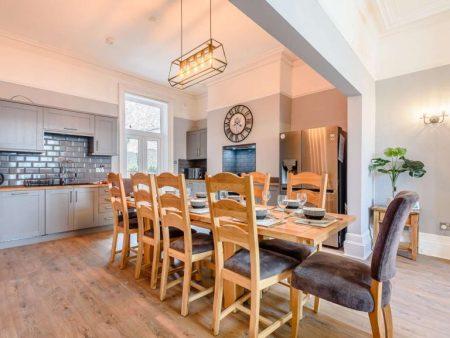 Entering this property guests benefit from a hallway where muddy boots and jackets can be cast off and where there is also a handy downstairs WC. A large and stylish kitchen features a breakfast bar where all the guests can convene before moving through double doors to the spacious dining room with a long wooden table. On the other side of the hallway through double doors is a large and comfortable living room with many snug sofas and enough space for the whole group to relax with Freesat TV. Upstairs five bright and airy bedrooms await you after a long day.